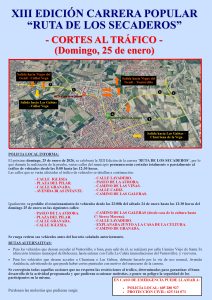 - Cortes de tráfico y cambios en el transporte por la Carrera Ruta de los SecaderosCORTES DE TRÁFICO La Policía Local informa que el próximo domingo, 25 de enero de 2026, se celebrará la prueba. Debido a esto, varias calles permanecerán cortadas total o parcialmente al tráfico desde las 8:00 hasta las 12:30 horas. Calles afectadas por cortes de tráfico: Calle Iglesia, Plaza del Pilar, Calle Granada, AvenidaLeer más