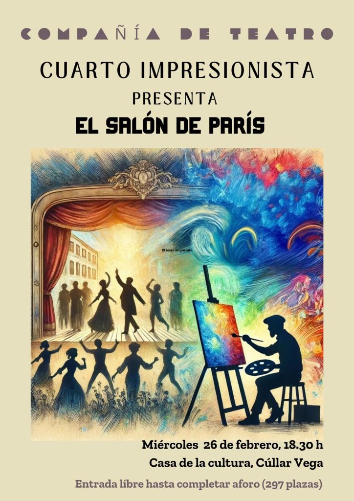 El grupo de teatro Cuarto Impresionista, integrado por alumnos y alumnas del IES Arabuleila de Cúllar Vega, presentará su obra «El Salón de París», bajo la dirección de su profesor Juan Jesús Pleguezuelos, el próximo miércoles 26 de febrero a las 18:30 horas en el Teatro de la Casa de la Cultura de Cúllar Vega.