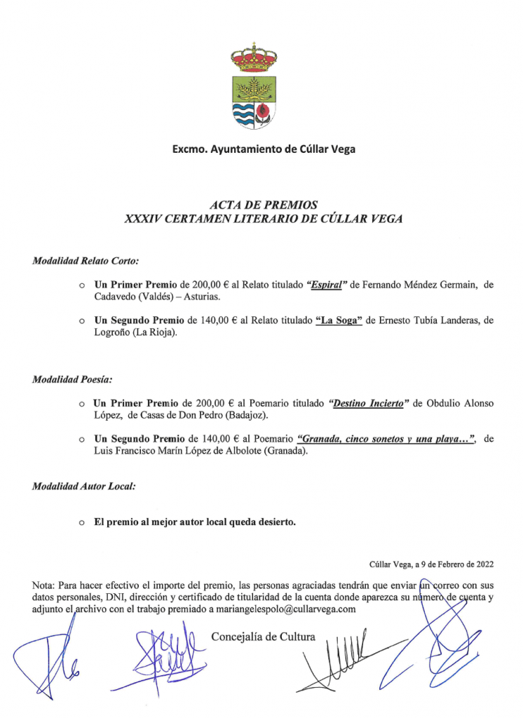 La XXXIV edición del Certamen Literario de Cúllar Vega de 2021 ya tiene premiados: