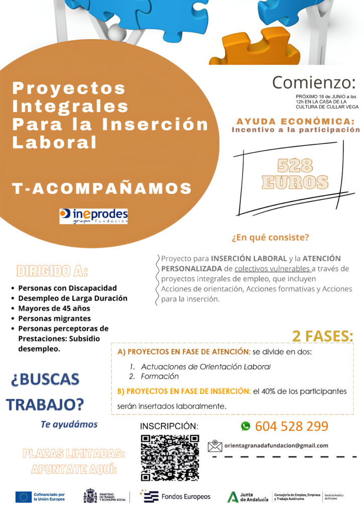 El Ayuntamiento de Cúllar Vega colabora con Fundación Grupo Ineprodes en el desarrollo del “Proyecto Integral para la inserción laboral T- Acompañamos” dirigido a personas desempleadas y que tiene como objetivo la Atención personalizada de colectivos vulnerables de nuestro municipio a través de proyectos integrales de empleo, que incluyen Acciones de orientación, Acciones formativas y Acciones para la inserción.