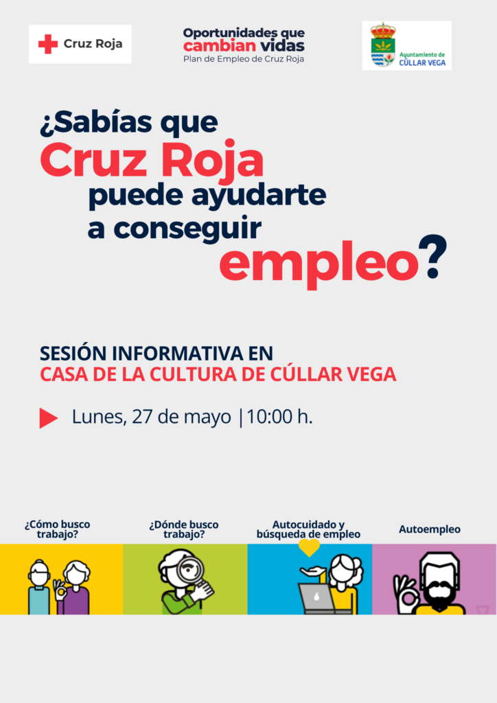 Si quieres saber como Cruz Roja puede ayudarte a conseguir empleo, no faltes a la sesión informativa el próximo lunes 27 de mayo a las 10:00 h en la Casa de la Cultura de Cúllar Vega, donde trataremos de como y donde buscas trabajo, del autocuidado y del autoempleo.