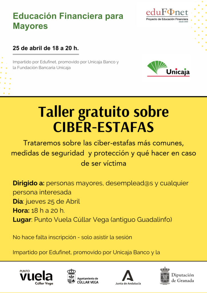 El Punto Vuela Cúllar Vega (antiguo Guadalinfo) organiza un taller gratuito sobre CIBER-ESTAFAS impartidos por Edufinet, promovido por Unicaja Banco y la Fundación Bancaria Unicaja, y dirigido a personas mayores, desempleados y cualquier persona interesada al respecto.