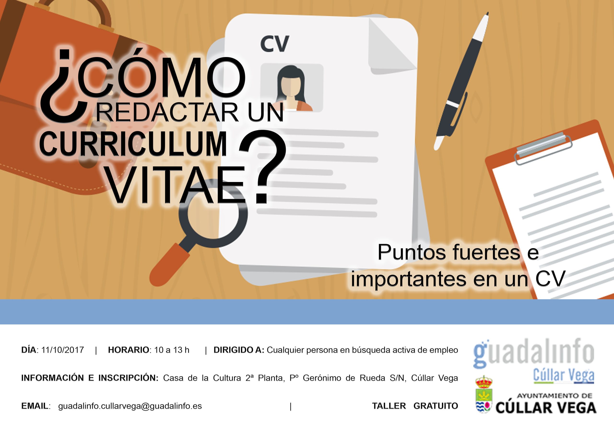 El próximo miércoles 11 de Octubre tendrá lugar un Taller de «CÓMO REDACTAR UN CURRÍCULUM VITAE» en el que se analizarán los PUNTOS FUERTES E IMPORTANTES a tener en cuenta