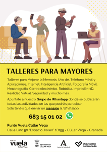 - El Punto Vuela de Cúllar Vega arranca una nueva etapa con talleres para mayoresEl Punto Vuela de Cúllar Vega vuelve a organizar una completa programación de talleres dirigidos especialmente a personas mayores que deseen aprender, mejorar sus habilidades digitales o simplemente mantenerse activos mentalmente y que comenzará a finales de octubre de 2025. Existe un grupo de Whatsapp donde se informa de todos los talleres queLeer más
