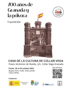 - Cúllar Vega acoge la exposición “700 años de Granada y la pólvora”La Casa de la Cultura de Cúllar Vega albergará, del 20 al 30 de octubre de 2025, la exposición “700 años de Granada y la pólvora”, una muestra que repasa la estrecha relación entre la provincia y la industria de la pólvora a lo largo de los siglos. La exposición, impulsada por elLeer más
