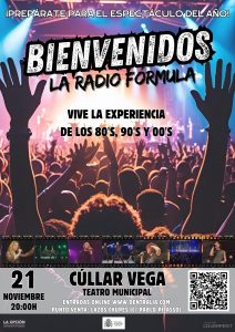 - ¡BIENVENIDOS! La Radio Fórmula en Cúllar Vega¿Cuándo? Viernes, 21 de noviembre ¿Dónde? en el Teatro Municipal ¿A qué hora? 20:00 Vídeo promocional: https://youtu.be/pAPn6SDfePo. Sinopsis:¿Eres de los que cantas en la ducha? ¿Cada día vas a trabajar con tu música favorita? ¿Te hace sonreír pensar en tu artista favorito? Esto es «Bienvenidos» La Radio Fórmula , un concierto que repasaLeer más