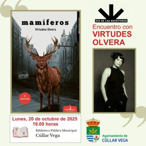 - La escritora Virtudes Olvera presenta su obra “Mamíferos” en la Biblioteca de Cúllar VegaCon motivo del Día de las Escritoras, el Ayuntamiento de Cúllar Vega organiza un encuentro con la autora Virtudes Olvera, quien presentará su libro “Mamíferos” el próximo lunes 20 de octubre a las 19:00 horas en la Biblioteca Pública Municipal. La obra, que ha alcanzado su segunda edición, reúne una serie de relatosLeer más