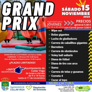 - Los jóvenes de Cúllar Vega se preparan para disfrutar del “Grand Prix” más divertido del añoEl Ayuntamiento de Cúllar Vega, a través de su Concejalía de Juventud y con la colaboración de la Diputación de Granada, organiza el Grand Prix 2025, una jornada de ocio y deporte destinada a jóvenes de entre 16 y 30 años. La actividad tendrá lugar el sábado 15 de noviembre, con salida aLeer más