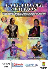 - La Peña Flamenca Frasquito Yerbabuena presenta “La Llama del Corazón” en Cúllar VegaLa Peña Flamenca Frasquito Yerbabuena acogerá el próximo viernes 14 de noviembre de 2025, a las 22:30 horas, el espectáculo “La Llama del Corazón”, un encuentro dedicado al cante, el toque y el baile flamenco. El evento, con entrada para socios e invitados, se celebrará en la sede de la peña, situada enLeer más