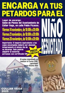 - Cúllar Vega abre el plazo para encargar los petardos del Niño Resucitado 2026El Ayuntamiento de Cúllar Vega ha anunciado las fechas para realizar los encargos de petardos destinados a la tradicional celebración del Niño Resucitado del año 2026. Los pedidos podrán realizarse en el Salón de Plenos del consistorio, ubicado en la calle Pablo Picasso, los días viernes 14, 21 y 28 de noviembre, enLeer más
