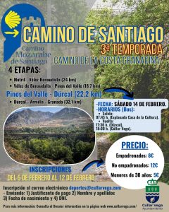 - 3ª etapa Ruta Santiago – Pinos del Valle – Dúrcal (22,2 km): información e inscripciones– Fecha: Sábado 14 de febrero de 2026 – Horarios (bus): salida 07:45 h. (explanada Casa de la Cultura) | vuelta 17:30 h. (Dúrcal) – 18:00 h. (Cúllar Vega) – Inscripciones: Las inscripciones se realizarán enviando justificante de pago, nombre completo, DNI, fecha de nacimiento y número de teléfono al correo deportes@cullarvega.com del 05Leer más