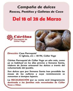 - Cáritas Parroquial pone en marcha su tradicional campaña de dulces artesanos por Semana SantaComo ya es tradición en los días previos a la Semana Santa, se abre una nueva edición de la Campaña de dulces organizada por Cáritas Parroquial de Cúllar Vega, para elaborar de forma artesanal estos productos con fines solidarios. Dulces con sabor a tradición Los vecinos y vecinas podrán adquirir los dulces típicosLeer más