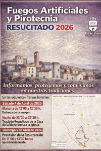 - Bando Informativo: Horarios de Pirotecnia y Fuegos Artificiales para el Resucitado 2026El Ayuntamiento de Cúllar Vega comunica a todos los vecinos y vecinas la programación de los espectáculos de fuegos artificiales y pirotecnia con motivo de la festividad del Resucitado 2026. Bajo el lema «Informamos, protegemos y convivimos con nuestras tradiciones», el consistorio hace públicos los horarios oficiales para garantizar una convivencia armoniosa yLeer más