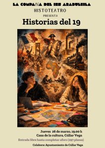 - El IES Arabuleila revive el siglo XIX con el estreno de «Historias del 19» en Cúllar VegaEl próximo jueves 26 de marzo la compañía de «Histoteatro» del IES Arabuleila presentará un viaje dramático que promete sumergir al espectador en las luces y sombras de una centuria que transformó el mundo para siempre. Detalles del evento