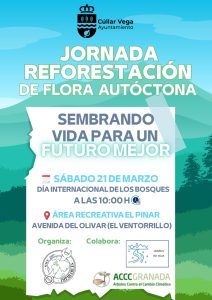 - Cúllar Vega se vuelca con el medio ambiente en una jornada de reforestación de flora autóctonaEl Ayuntamiento de Cúllar Vega ha organizado una iniciativa de reforestación de flora autóctona que tendrá lugar el próximo sábado 21 de marzo, coincidiendo con la efeméride del Día Internacional de los Bosques. Bajo el lema «Sembrando vida para un futuro mejor», esta propuesta busca concienciar a la ciudadanía sobre la importancia deLeer más