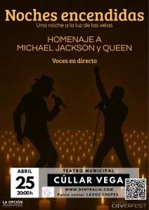 - El Teatro de Cúllar Vega vibrará con un tributo a Michael Jackson y Queen bajo la luz de las velasEl próximo 25 de abril, el Teatro Municipal de Cúllar Vega se convertirá en un escenario mágico con la celebración de «Noches Encendidas», una experiencia musical única diseñada para disfrutarse a la luz de las velas. En esta ocasión, el espectáculo rendirá un sentido homenaje a Michael Jackson y Queen, dos de losLeer más