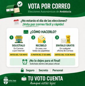 - Abierto el plazo para solicitar el voto por correo para las Elecciones AutonómicasEl Ayuntamiento de Cúllar Vega comunica a todos los vecinos y vecinas que ya pueden iniciar los trámites para ejercer su derecho al voto por correo de cara a las próximas Elecciones Autonómicas de Andalucía. Esta modalidad es la opción ideal para aquellas personas que no puedan acudir presencialmente a su colegio electoralLeer más