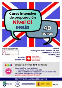 - Curso Intensivo de preparación del nivel C1 de InglésLa Concejalía de Juventud del Ayuntamiento de Cúllar Vega pone en marcha de nuevo el proyecto CULLAR VEGA EDUCAJOVEN financiado a través de la convocatoria a Entidades Locales del INJUVE (Ministerio de Infancia y Juventud – Gobierno de España) y la Federación Española de Municipios y Provincias. Y comenzamos con un curso intensivoLeer más
