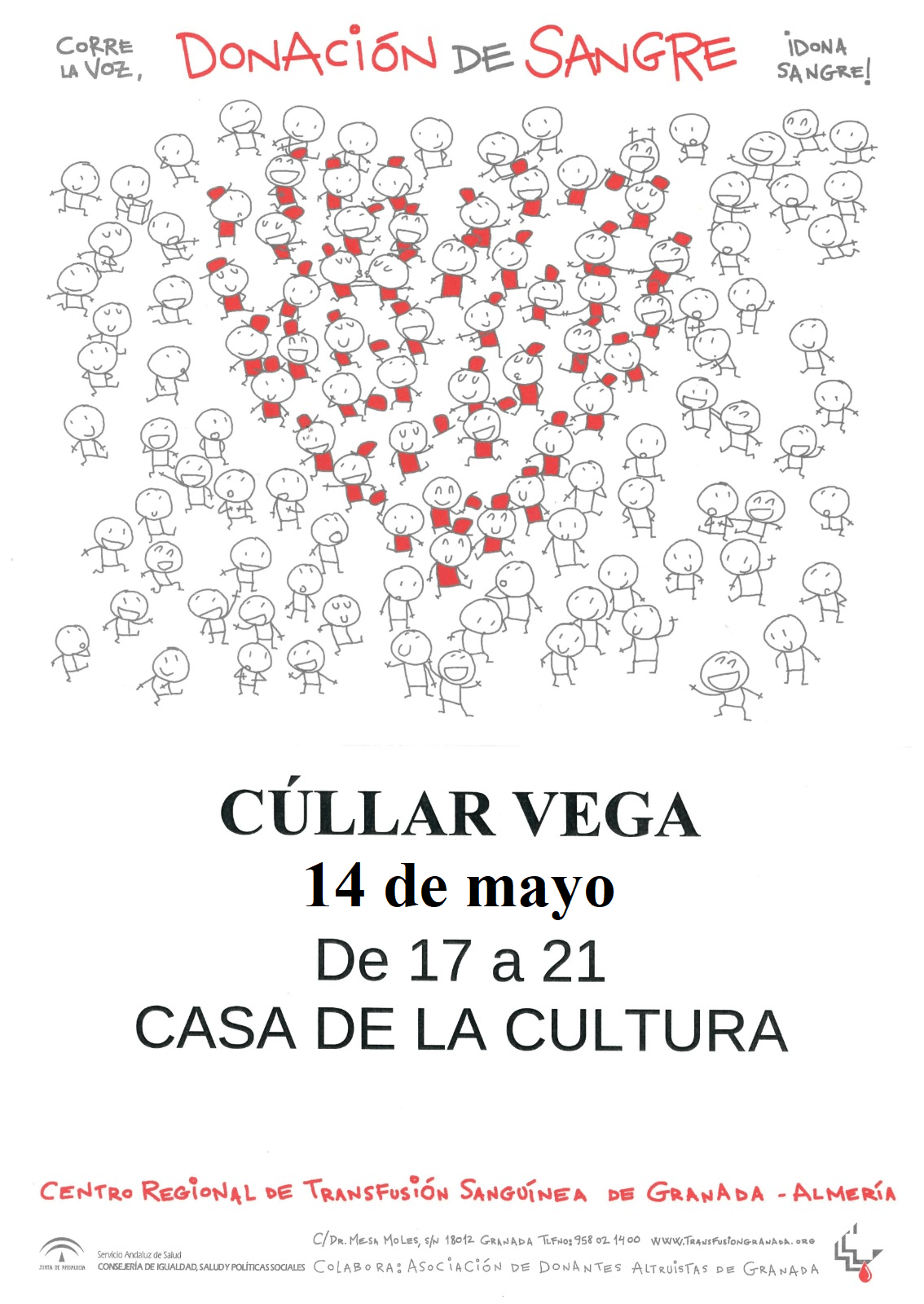 Nueva cita solidaria hoy jueves 14 de mayo de 2020: DONACIÓN DE SANGRE de 17 a 21 h. en la Casa de la Cultura de Cúllar Vega