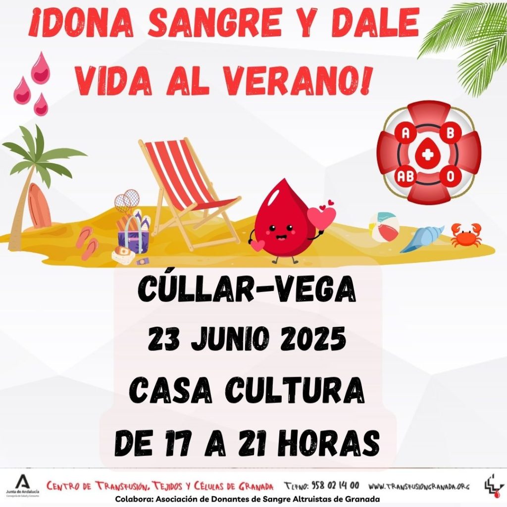 El lunes 23 de junio de 2025 de 17 a 21 h DONACIÓN DE SANGRE en la Casa de la Cultura de Cúllar Vega.
