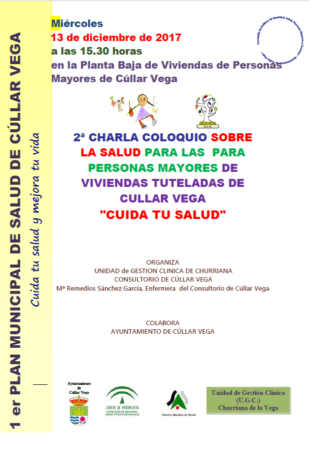 El próximo miércoles 13 de diciembre de 2017 a las 15.30 horas y en la Planta Baja de Viviendas de Personas Mayores de Cúllar Vega, tendrá lugar la 2ª Charla Coloquio sobre la Salud de las Personas Mayores de Viviendas Tuteladas de Cúllar Vega «Cuida tu Salud» dentro del 1er Plan Municipal de Salud de Cúllar Vega «Cuida tu Salud y Mejora tu Vida»