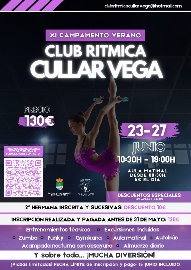 Del 23 al 27 de junio, el Club Rítmica Cúllar Vega organiza su esperado XI Campamento de Verano, una semana llena de actividades para disfrutar, aprender y compartir en un entorno saludable y dinámico.