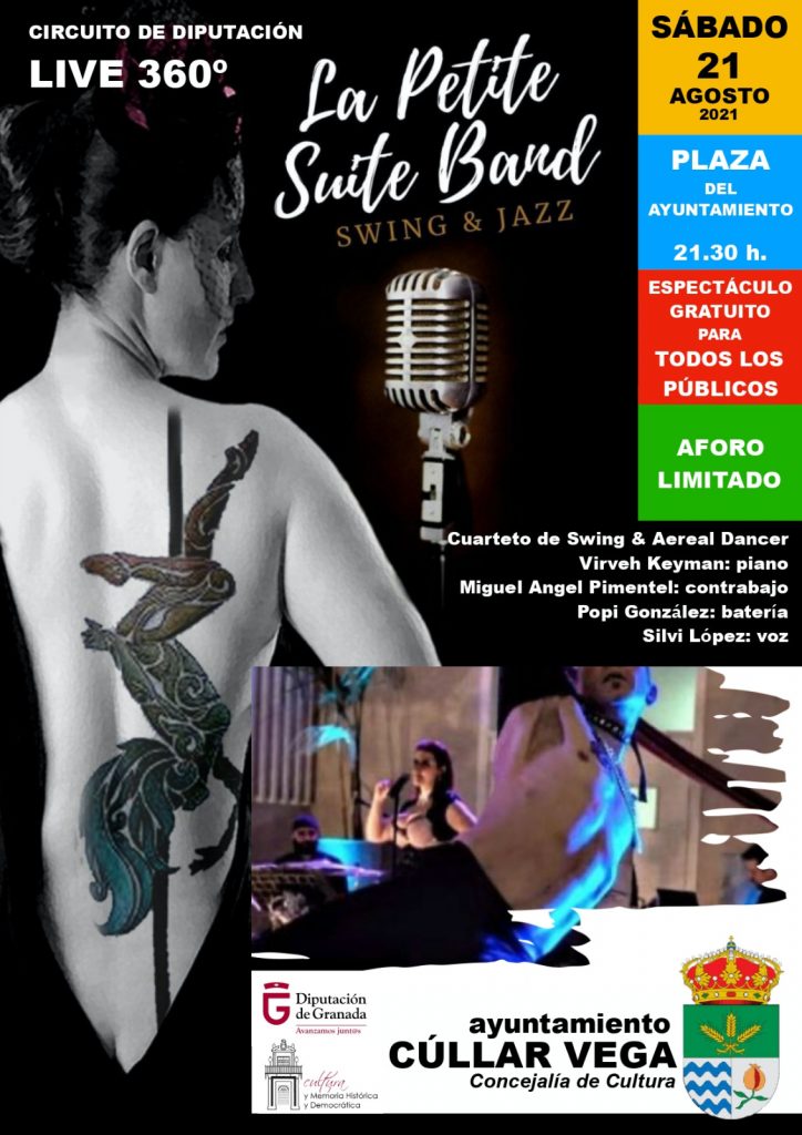 Actuación de La Petite Suite Band + Aereal Dancer dentro del Programa Live 360º de la Diputación de Granada con Virveh Keyman al piano, Miguel Ángel Pimentel al contrabajo, Popi González a la batería y la voz de Silvi López.