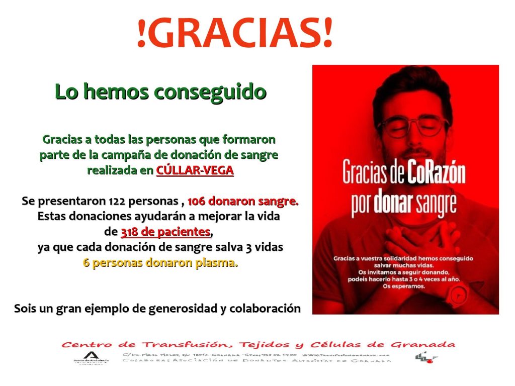 Desde el Centro de Transfusión de Granada agradecen a todas las personas que han formado parte de la campaña de donación de sangre. Se presentaron 122 personas de las que 106 donaron sangre y 22 plasma, lo que ayudarán a mejorar la vida de 318 pacientes, ya que cada donación de sangre salva 3 vidas.