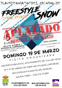 Informamos de que con motivo de la climatología prevista para la salida de mañana, 15 de marzo, a Sierra Nevada para ver el Campeonato del Mundo de Freestyle y Snow, nos vemos obligados a aplazar la excursión al próximo domingo, 19 de marzo.