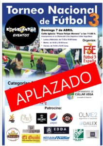 El “I Torneo Nacional de Fútbol 3×3 plaza de Cúllar Vega” organizado por Fútbol 3 España, Diverlandya Eventos y la Concejalía de Deportes previsto para este próximo domingo, 7 de abril, se APLAZA al próximo sábado, 13 de abril, manteniendo el lugar de celebración del evento y programación a causa de la previsión de las inclemencias meteorológicas: