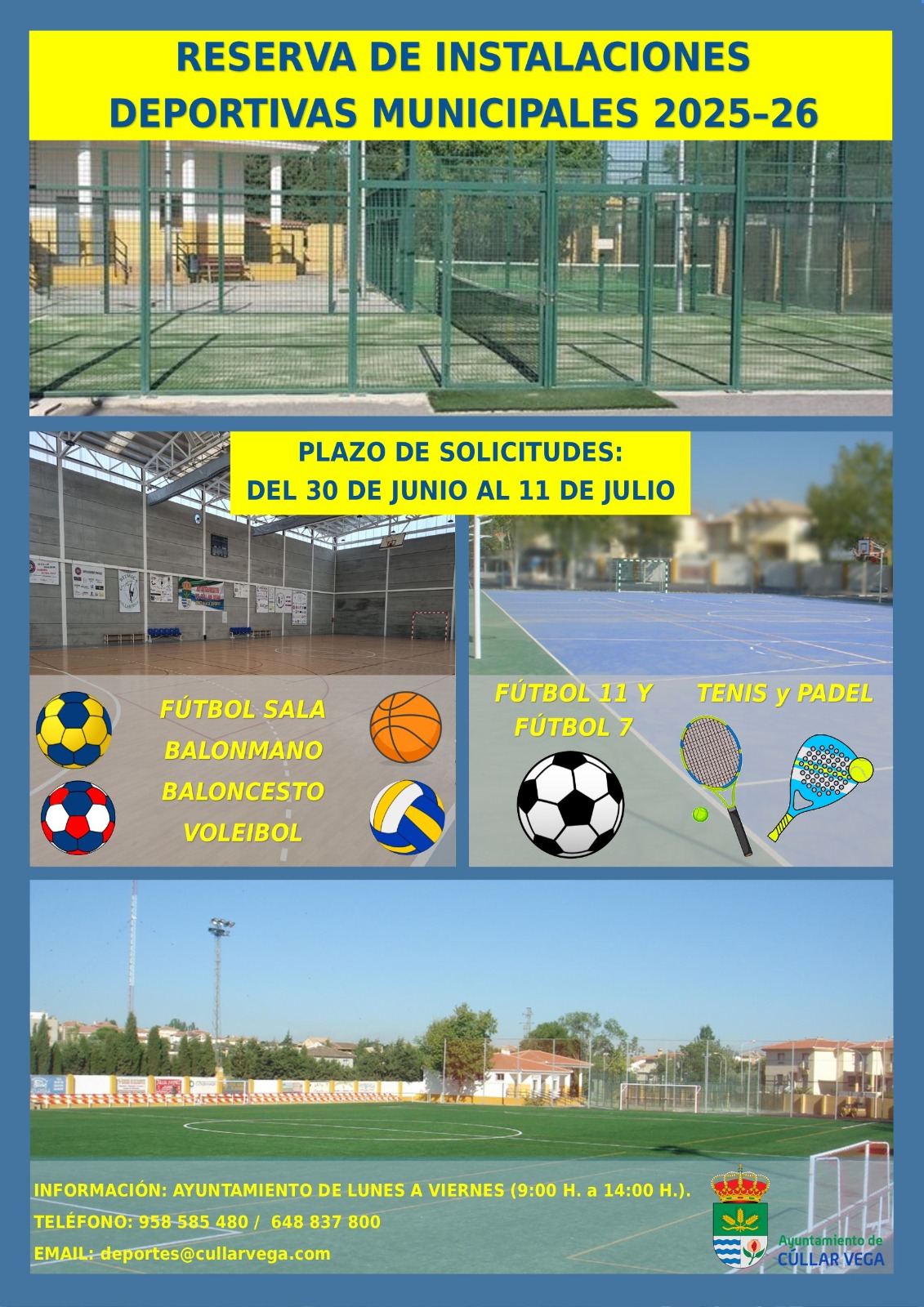 El Ayuntamiento de Cúllar Vega ha abierto el plazo de solicitudes para la reserva de las instalaciones deportivas municipales de cara a la temporada 2025-2026. Las personas interesadas podrán realizar su solicitud entre el 30 de junio y el 11 de julio. Las instalaciones disponibles incluyen espacios para la práctica de fútbol sala, balonmano, baloncesto, voleibol, fútbol 11, fútbol 7,