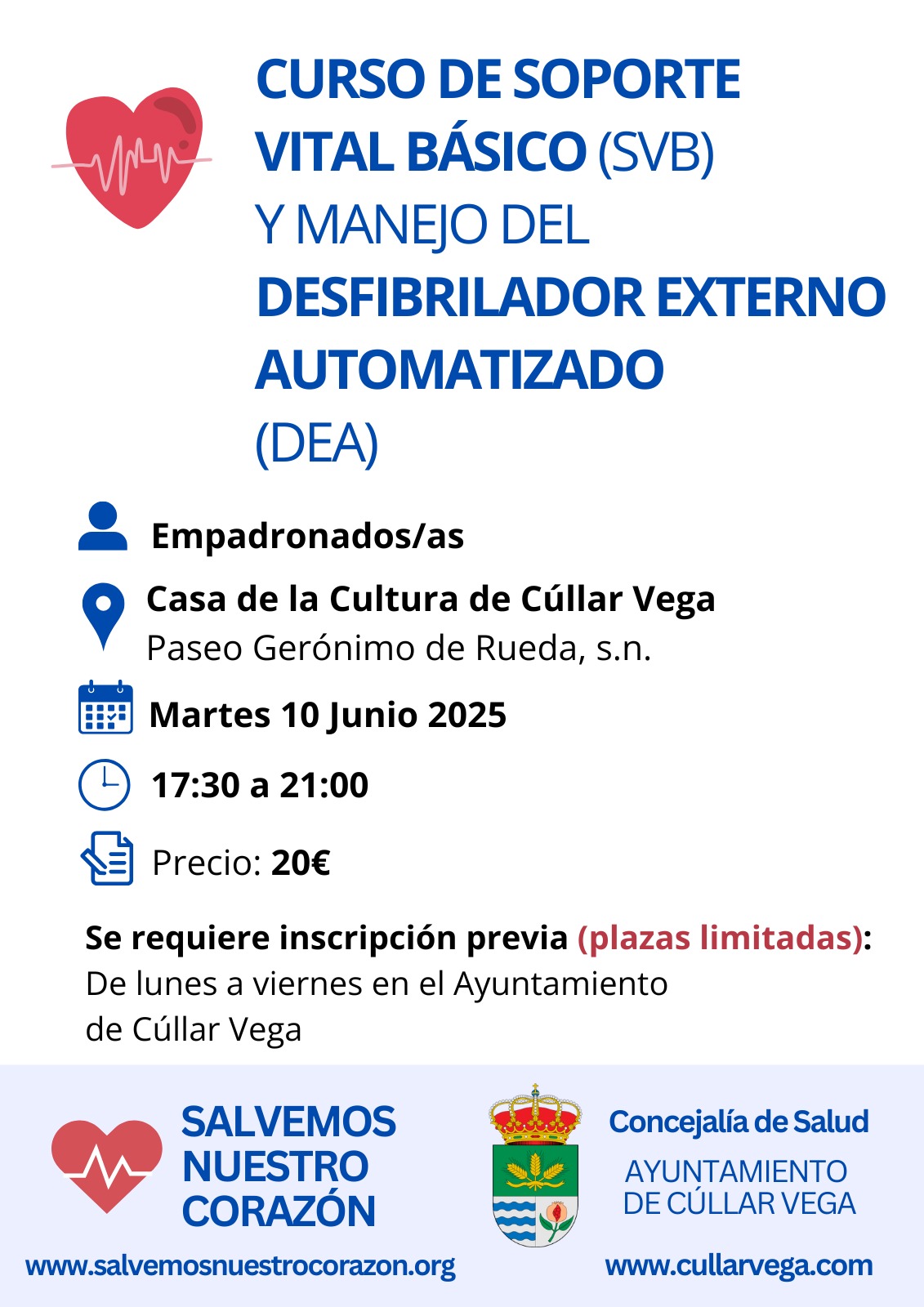 La Concejalía de Salud del Ayuntamiento de Cúllar Vega ha organizado un nuevo curso de Soporte Vital Básico (SVB) y manejo del Desfibrilador Externo Automatizado (DEA), dirigido a personas empadronadas en el municipio. La formación se celebrará el próximo martes 10 de junio de 2025, en horario de 17:30 a 21:00 horas, en la Casa de la Cultura de Cúllar