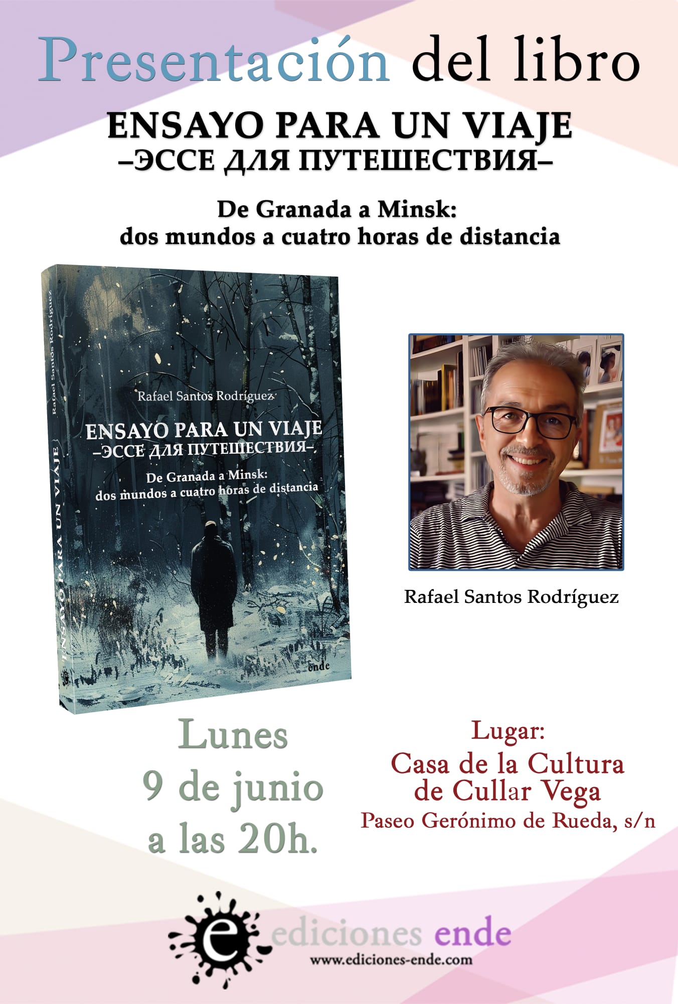 El próximo lunes 9 de junio a las 20:00 h, la Casa de la Cultura de Cúllar Vega será el escenario de la presentación del libro Ensayo para un viaje –ЭССЕ ДЛЯ ПУТЕШЕСТВИЯ–, del escritor Rafael Santos Rodríguez. Con el sugerente subtítulo «De Granada a Minsk: dos mundos a cuatro horas de distancia», esta cita es imprescindible para los amantes