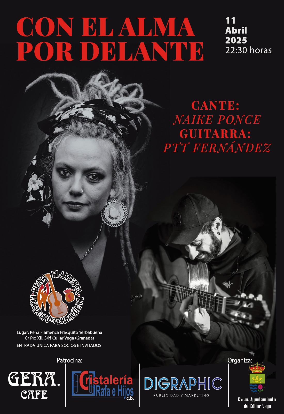 El próximo 11 de abril de 2025, la Peña Flamenca Frasquito Yerbabuena de Cúllar Vega será el escenario de un espectáculo flamenco único: «Con el alma por delante», con la voz de Naike Ponce y la guitarra de Ptt Fernández. El evento, que dará comienzo a las 22:30 h, promete una noche cargada de emoción, pasión y duende, con la