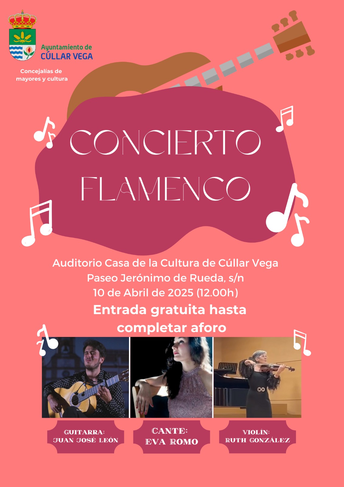 El próximo 10 de abril de 2025, el Auditorio de la Casa de la Cultura de Cúllar Vega acogerá un extraordinario concierto flamenco, donde la tradición y la emoción se unirán en un espectáculo único. El evento dará comienzo a las 12:00 h y contará con las destacadas actuaciones de:– Juan José León a la guitarra– Eva Romo al cante–