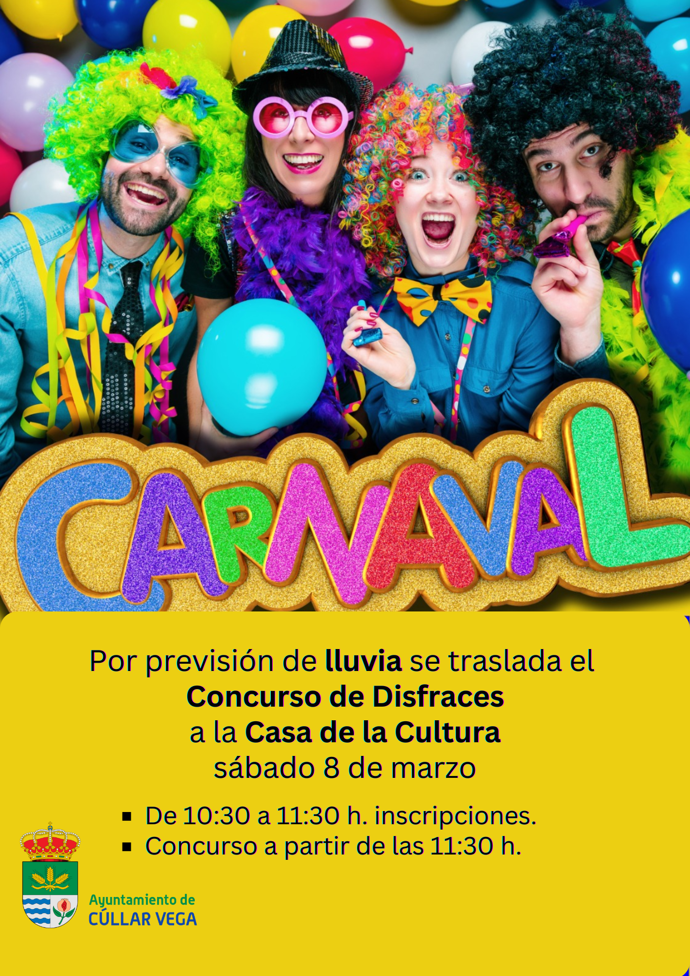 Se informa que, debido a la previsión de lluvias para el sábado 8 de marzo, el Concurso de Disfraces se traslada a la Casa de la Cultura, siendo el horario de inscripción de 10:30 a 11:30 h. El resto de actividades previstas al aire libre quedan canceladas. Agradecemos la comprensión y animamos a todos a participar en el concurso.