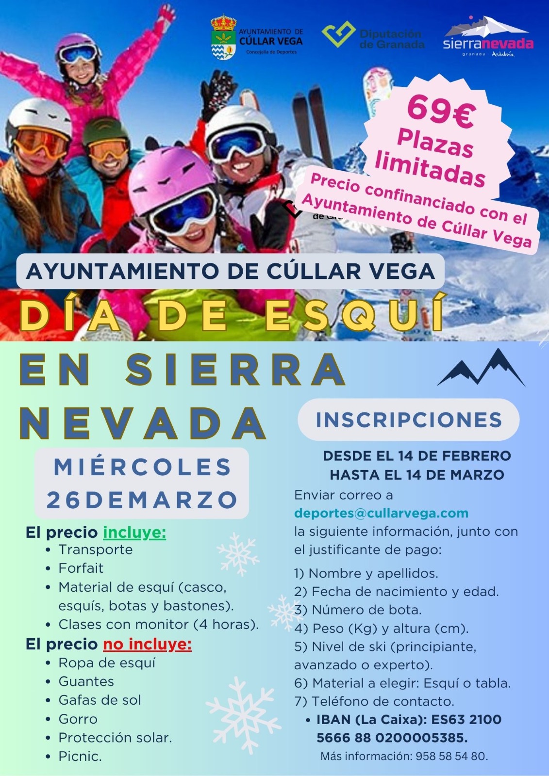Si te gusta la nieve, no te puedes perder esta oportunidad única de pasar un día de esquí en Sierra Nevada el próximo miércoles 26 de marzo. El precio incluye transporte, forfait, material de esquí (casco, esquís, botas y bastones) y 4 horas de clases con monitor. No incluye ropa de esquí, guantes, gafas de sol y gorro, protección solar