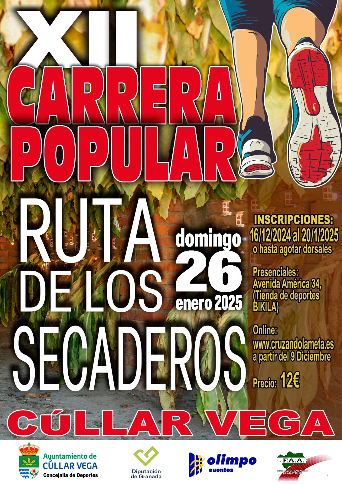 Organizada por el Ayuntamiento de Cúllar Vega, la prueba tendrá un recorrido de 7,5 kilómetros en la categoría absoluta, que transcurrirá entre secaderos de tabaco Los amantes del ‘running‘ tienen una cita para correr por la Vega de Granada este domingo, 26 de enero. El municipio de Cúllar Vega acogerá la XII Carrera Popular “Ruta de los secaderos”, una de