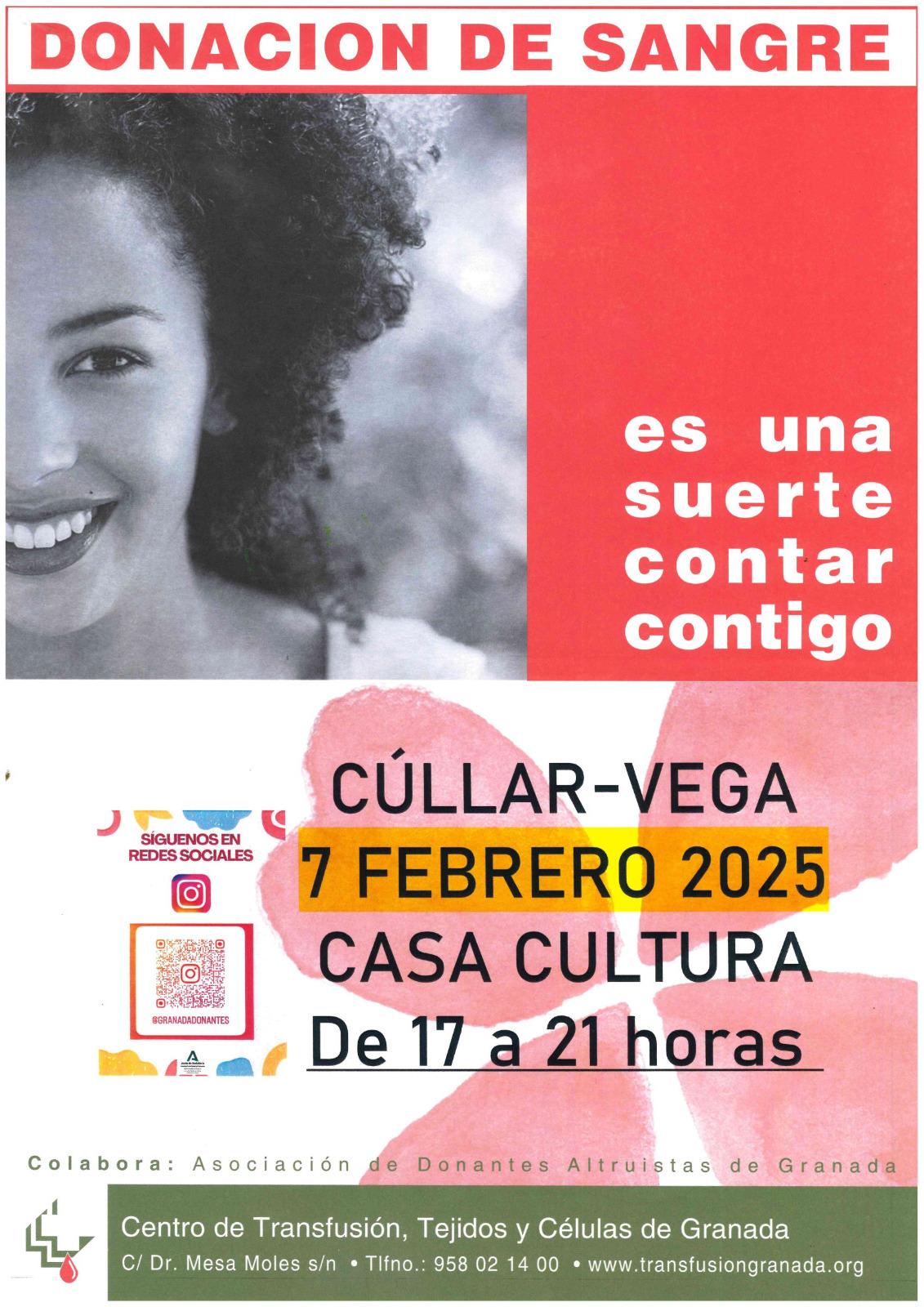 El viernes 07 de febrero de 2025 de 17 a 21 h DONACIÓN DE SANGRE en la Casa de la Cultura de Cúllar Vega. Recarga Vidas. Dona Sangre. No faltes a esta cita con la solidaridad.