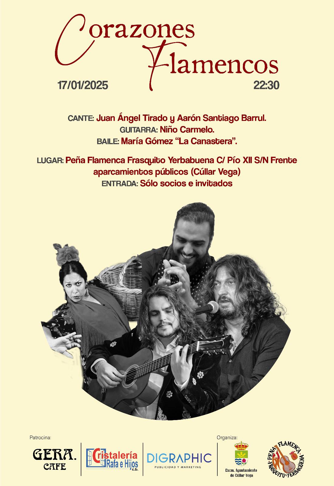 El próximo 17 de enero de 2025 a las 22:30 horas, la Peña Flamenca Frasquito Yerbabuena de Cúllar Vega acogerá el evento «Corazones Flamencos». Con las voces de Juan Ángel Tirado y Aarón Santiago Barrul, la guitarra de Niño Carmelo y el baile de María Gómez «La Canastera». Puedes pasar a recoger tu invitación en el Ayuntamiento en horario de