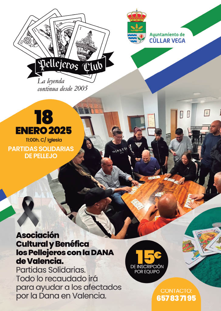 El sábado 18 de enero de 2025, a las 11:00 h, la Asociación Cultural y Benéfica Los Pellejeros organiza partidas solidarias de pellejo en la calle Iglesia de Cúllar Vega. La inscripción es de 15€ por equipo, y los fondos recaudados se destinarán íntegramente a los afectados por la DANA en Valencia. Un evento lleno de solidaridad y tradición, respaldado