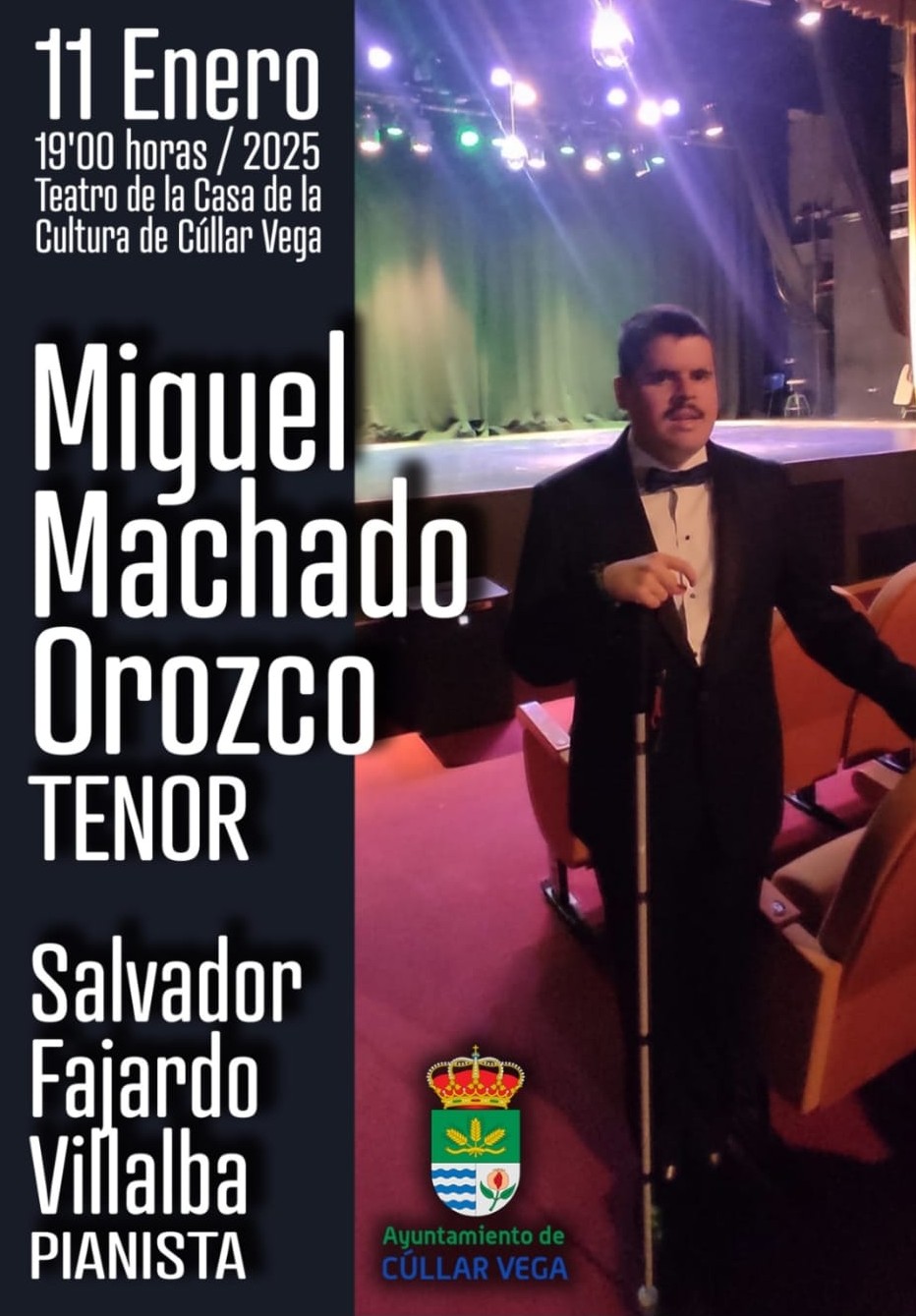 El próximo sábado 11 de enero de 2025, a las 19:00 horas, el Teatro de la Casa de la Cultura de Cúllar Vega será el escenario de un concierto del tenor Miguel Machado Orozco acompañado al piano por Salvador Fajardo Villalba. Recoge tu invitación en el Ayuntamiento y en la Casa de la Cultura.