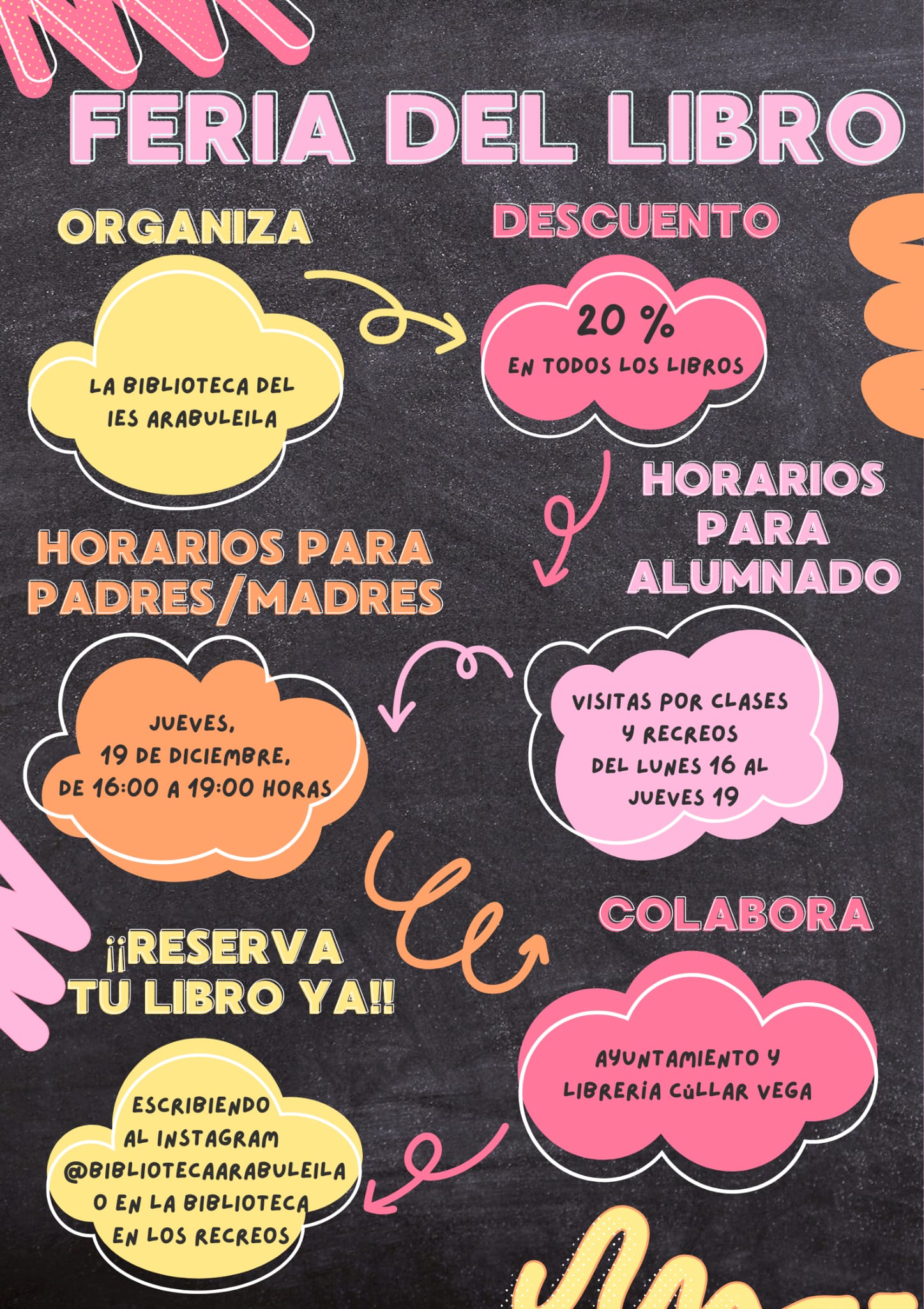 La Biblioteca del IES Arabuleila de Cúllar Vega se complace en anunciar su Feria del Libro en colaboración con el Ayuntamiento de Cúllar Vega, y que se llevará a cabo del lunes 16 al jueves 19 de diciembre con un descuento del 20 % en todos los libros. Horarios de la feria: Los interesados en reservar su libro pueden hacerlo