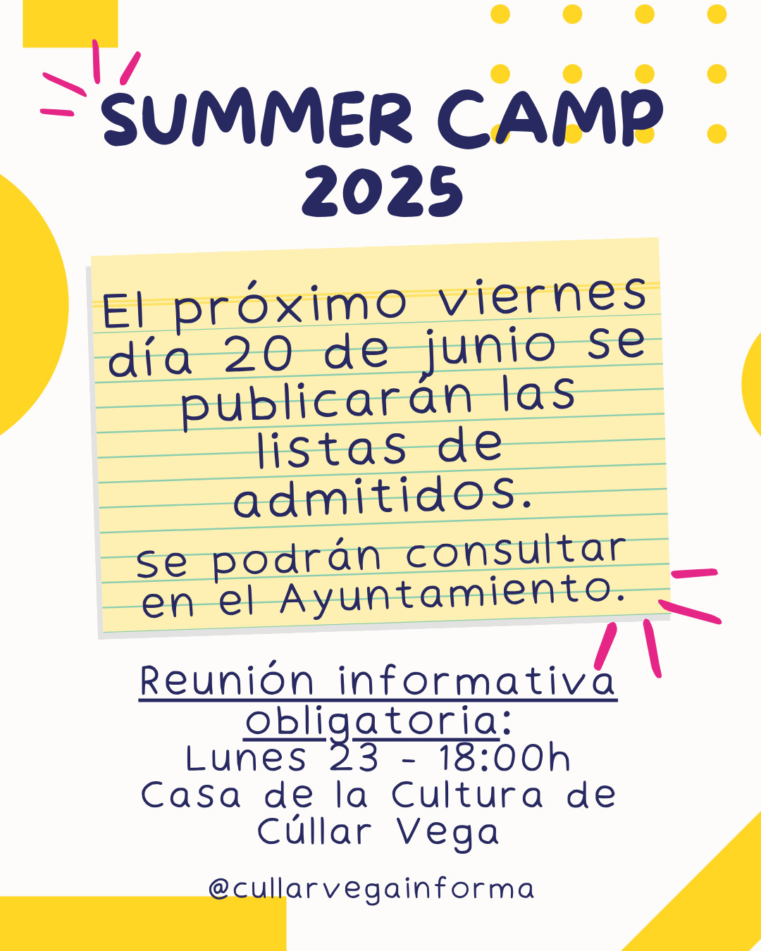 Listado de admitidos Summer Camp 2025. https://www.cullarvega.com/wp-content/uploads/2025/06/LISTADO-ADMITIDOS-SUMMER-CAMP-2025-A-20-DE-JUNIO-DE-2025.docx REUNIÓN INFORMATIVA EL PRÓXIMO LUNES 23 DE JUNIO A LAS 18:00 EN LA CASA DE LA CULTURA Resolución complementaria a la resolución de aprobación de las bases para ser beneficiario de la subvención Corresponsables 2025: https://www.cullarvega.com/wp-content/uploads/2025/06/20250620_Resolucion_Decreto-de-Alcaldia-_-Decreto-de-Presidencia-_DECRETO-2025-0680-RESOLUCION-COMPLEMENTARIA-BASES-CONCESION-CORRESPONSABLES.pdf