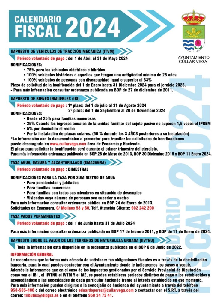 Desde la Concejalía de Economía y Hacienda le ofrecemos información relativa sobre las principales Tasas e Impuestos, así como períodos de pago y plazos para solicitudes de Fraccionamientos y Bonificaciones existentes al respecto para el presente año 2024.