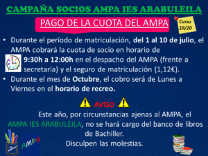 Durante el período de matriculación, que será del 1 al 10 de Julio, el Ampa cobrará la cuota de socio en horario de 9´30 a 12´00 horas en el despacho del Ampa (Frente a secretaría).