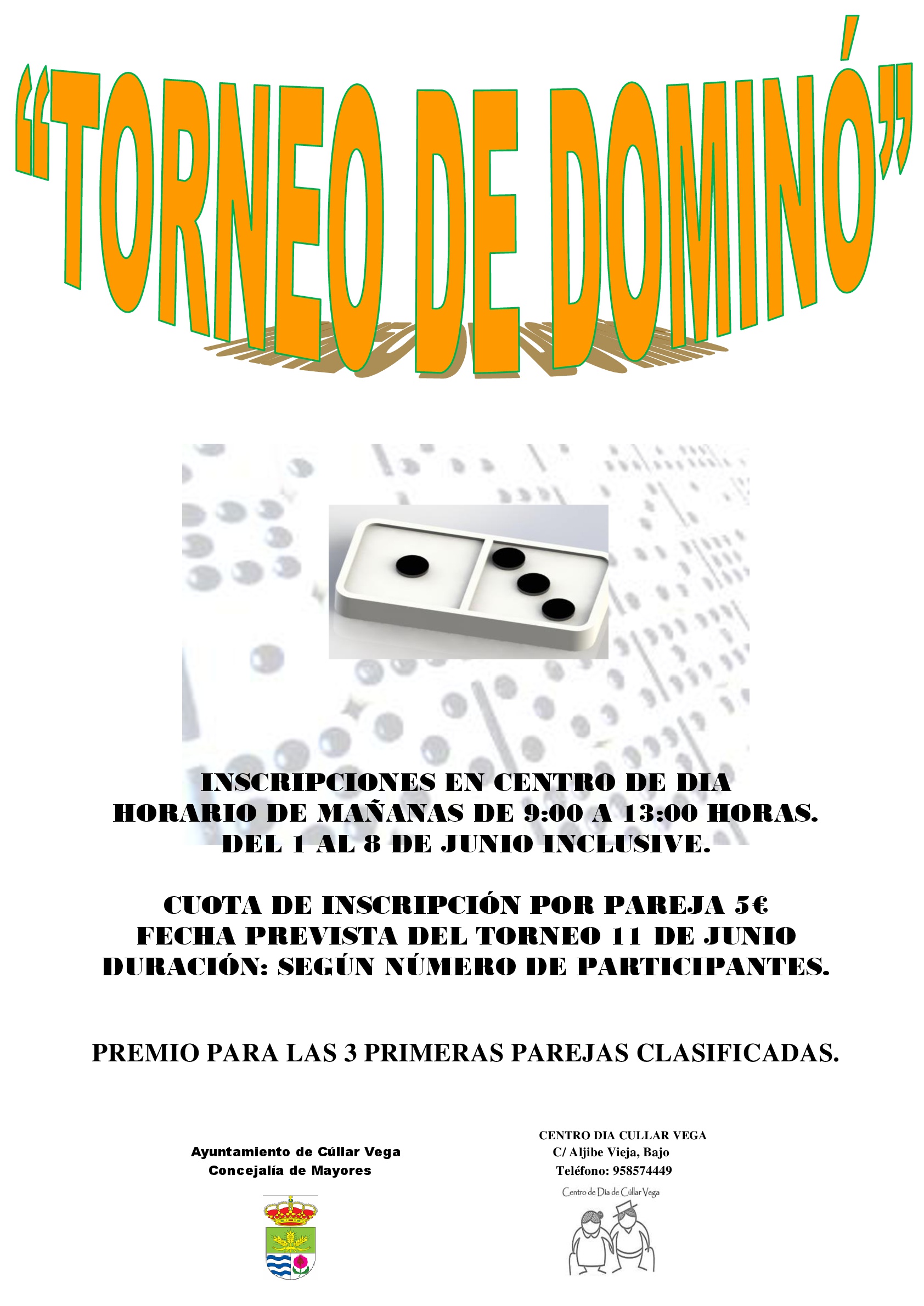 Participa en el Torneo de Dominó del Centro de Día Inscripciones en el Centro de Día en horario de mañanas de 9´00 a 13´00 horas del 1 al 8 de junio inclusive. Cuota de Inscripción por pareja: 5,00 € Fecha prevista del torneo: 11 de Junio La duración dependerá del número de participantes inscritos. Habrá premio para las