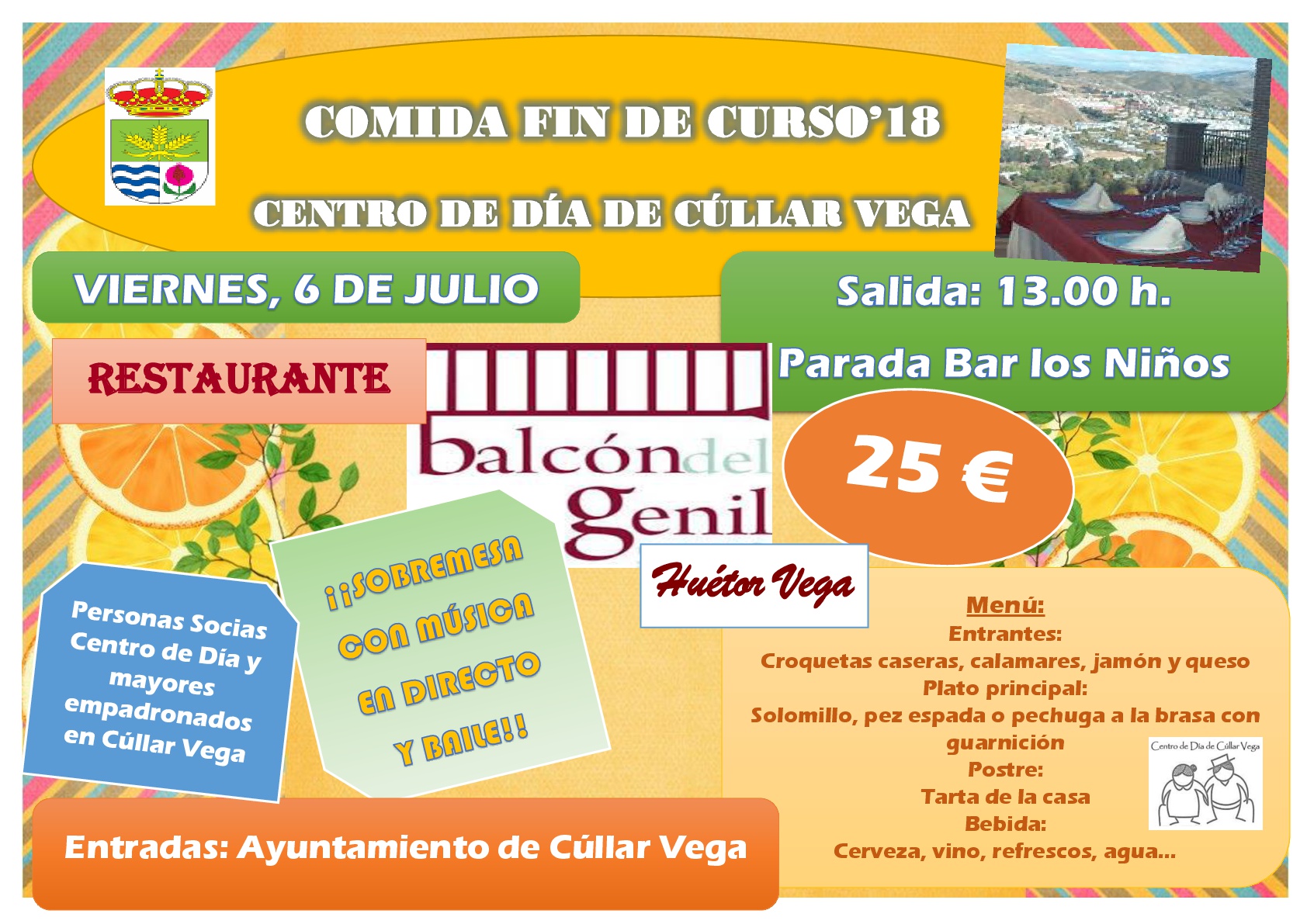 La tradicional comida de Fin de Curso del Centro de Día tendrá lugar el Viernes día 6 de Julio en el Restaurante Balcón del Genil Inscripciones: 25,00 € en el Ayuntamiento en horario de 9´00 a 14´00 horas Habrá sobremesa con música en vivo ¡No faltes!