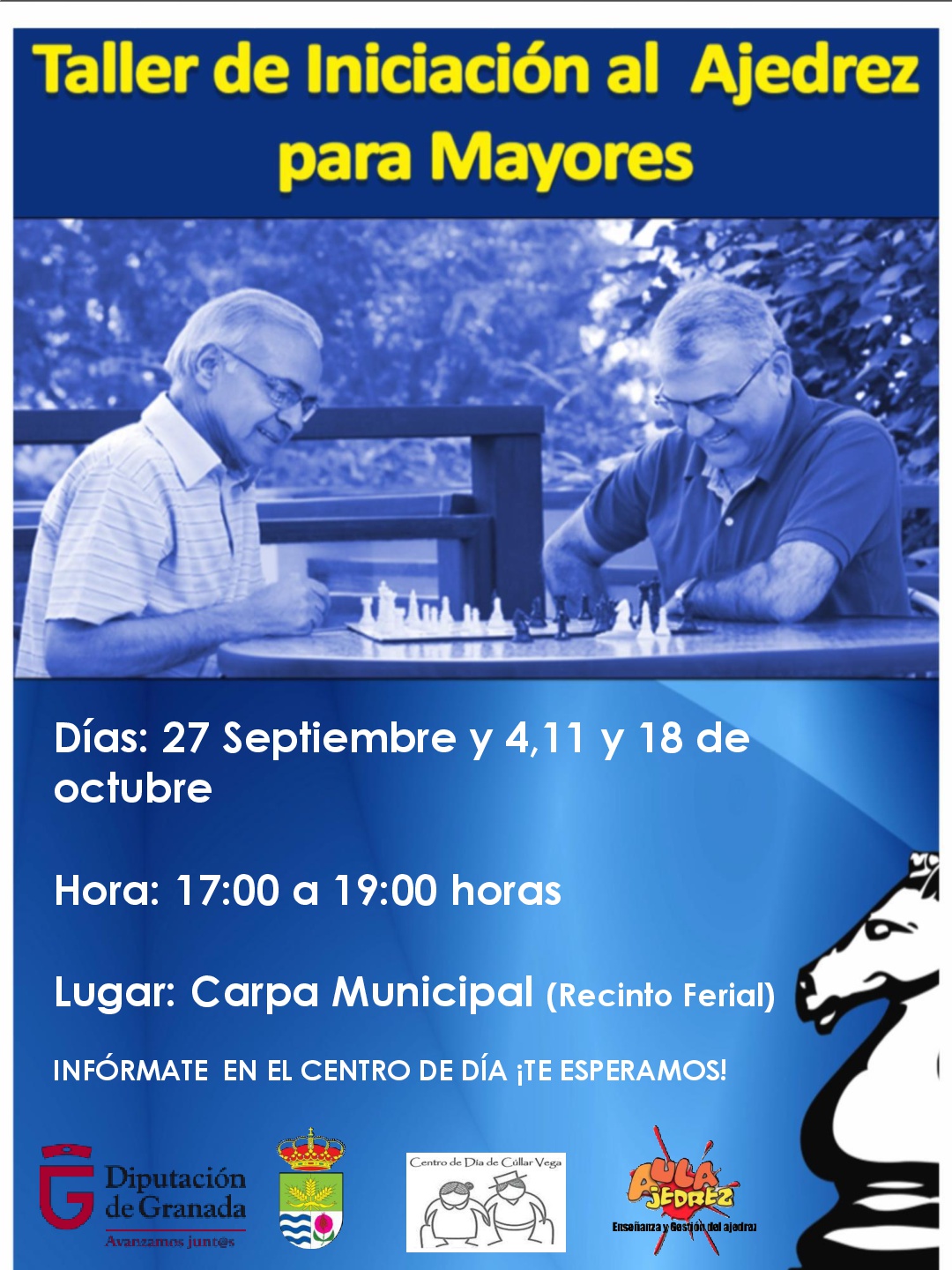 Los días 27 de Septiembre y 4, 11 y 18 de Octubre tendrá lugar un interesante Taller de iniciación al Ajedrez para personas mayores en la Carpa Municipal de la Caseta del Ferial de Cúllar Vega. Horario: 17:00 a 19:00 h. Infórmate en el Centro de Día