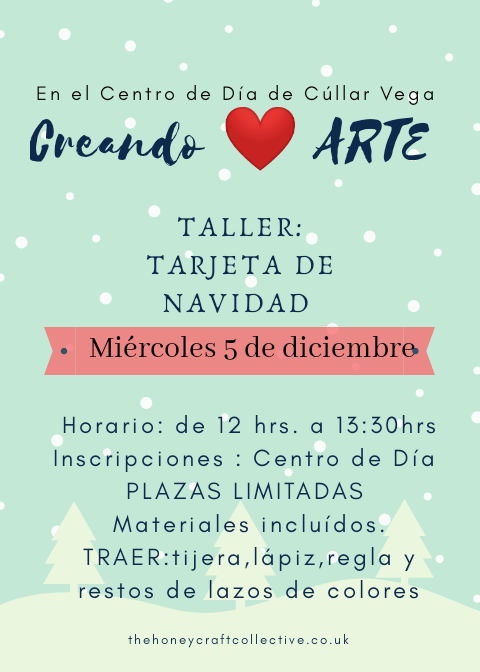 El próximo miércoles 5 de Diciembre de 2018 se va a realizar un TALLER DE CREACIÓN DE TARJETAS DE NAVIDAD de 12 a 13:30 h en el Centro de Día. Información e inscripciones en el Centro de Día. Plazas Limitadas. Materiales incluidos (sólo deben traer: Tijera, Lápiz, Regla y restos de Lazos de Colores)